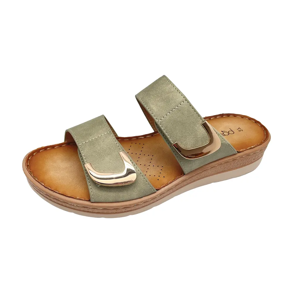 Bare Traps PAMPER in SAGE is a classic 2-Bar Velcro Casual Slide. The sandal features 2 Velcro Straps adorned with C Shape Gold Metallic Trims. The slide is made on an ultra light weight Natural wedge and has a thick padded insole. A smart easy wearable slide for summer.