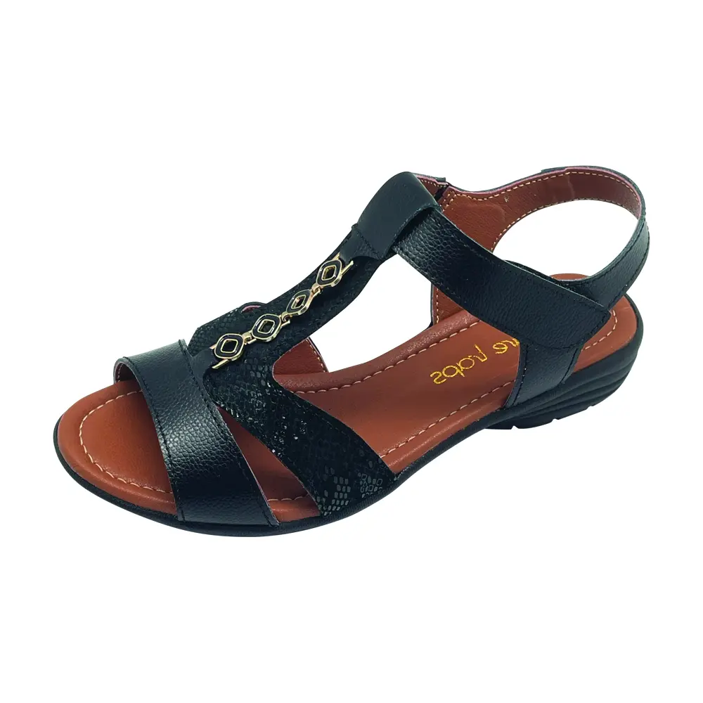 Bare Traps leather sandal ALLY is something to talk about. So many features you'll love with its beautiful BLACK Leather T-Bar design with Print Suede centre straps and Black-Gold metal trim. Tan lining and Tan padded sock, Black Rubber flexible Wedge.