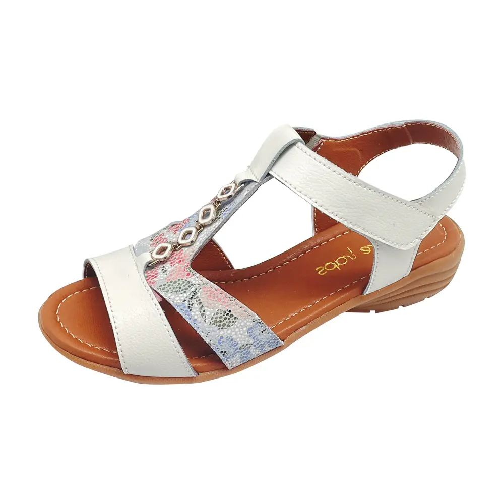 Bare Traps leather sandal ALLY is something to talk about. So many features you'll love with its beautiful WHITE Leather T-Bar design with Print Suede centre straps and Black-Gold metal trim. Tan lining and Tan padded sock, Black Rubber flexible Wedge.