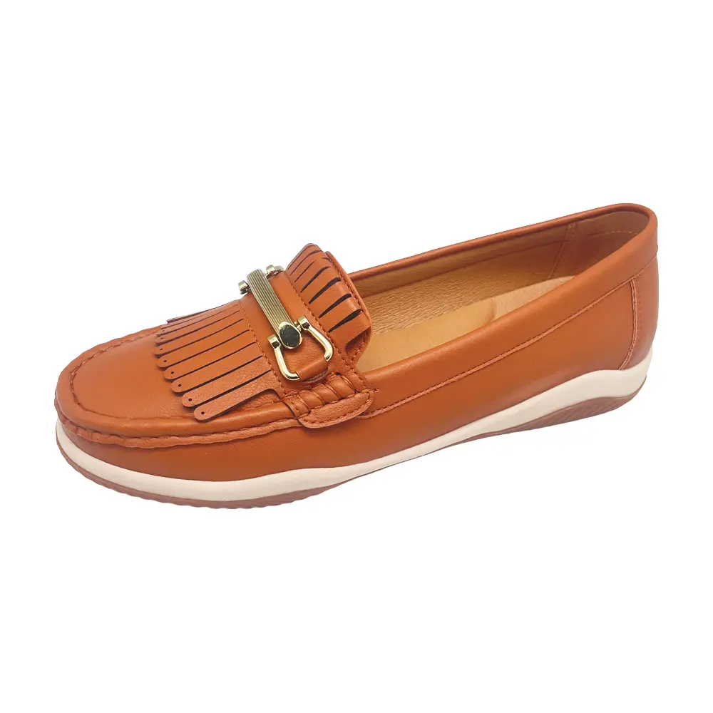 Slip into the Bare Traps New Wedge Moccasin BOND in BROWN. It features a Smooth Feel material upper with lovely Fringe Detail. It is also adorned with a Gold trim. Lining is soft Natrual PU and the sock is padded with memory foam. The shoe is made on a Low (27mm) 2-Colour Rubber Wedge. An ideal choice for All Day wear.