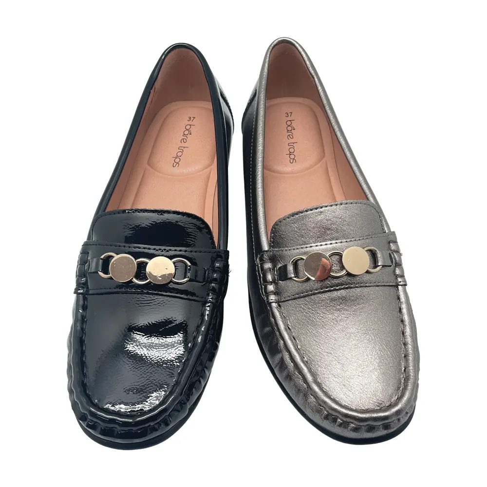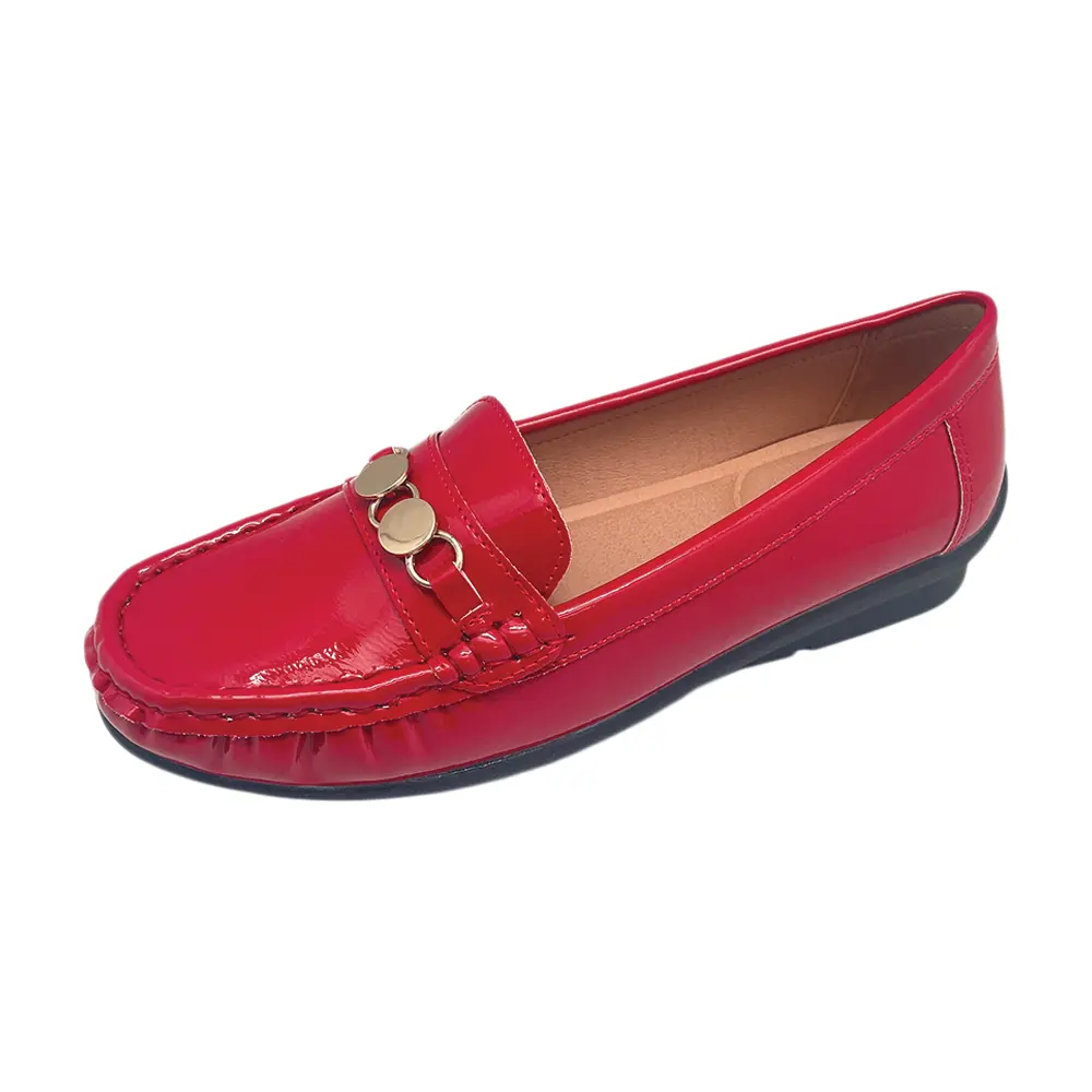 Slip into Bare Traps Super Value Moccasin PIVOT in RED this Autumn-Winter for the ultimate in style and comfort. Featuring a neat PATENT upper adorned with a beautiful Gold Chain Trim to the vamp. A versatile slip-on with a Low lightweight flexible sole and padded insole for extra comfort. An ideal choice for the coming cooler weather.