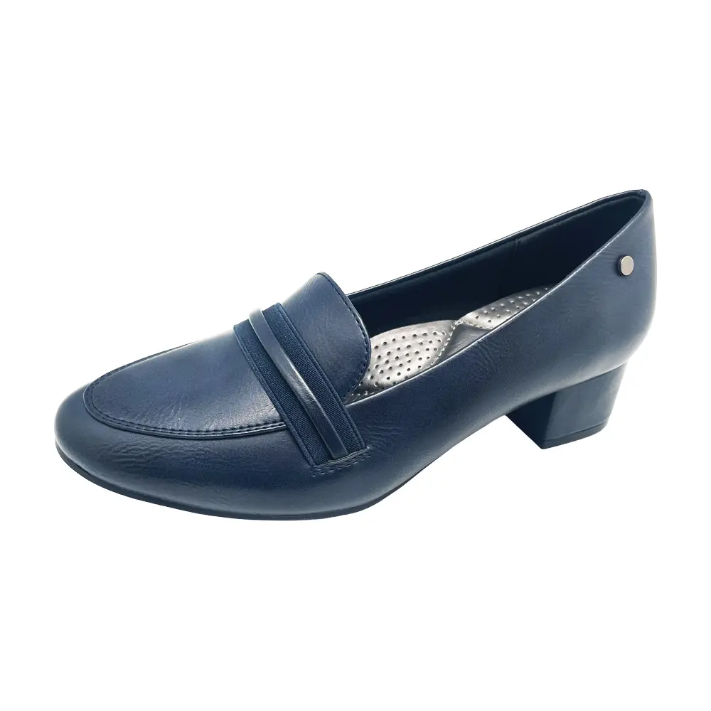Bare Traps style REGENT in NAVY is classic low heel loafer slip-on. This simple timeless pump in BLACK has a Smooth leather-like upper with matching elastic-smooth overlay and stud ornament. The lining is soft foam padded and the sock is metallic with padding. It has a rounded toe ahd sits on a 45mm self-covered heel. The sole is flex rubber. A Classic style that your feet will love!