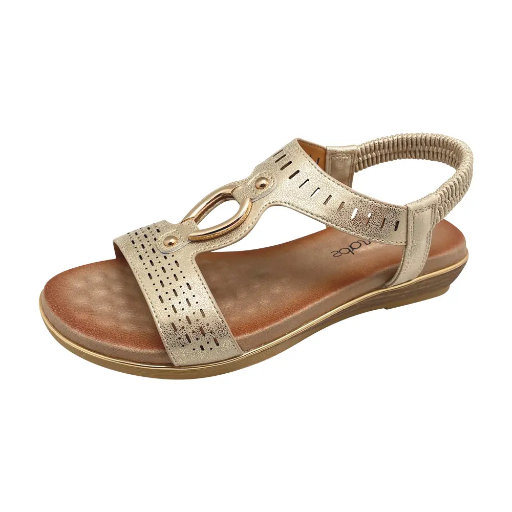 Bare Traps FRITZ in GOLD is a style you'll love to wear. The T-Bar Upper design features a GOLD Circle Trim on a Neat Patterned Lasercut Design. The back strap is elasticised for easy entry. The Natural Insole features 10mm foam padding and the Natural Stack wedge is finished with a Gold binding. Perfectly detailed and stylish for Summer Wear.