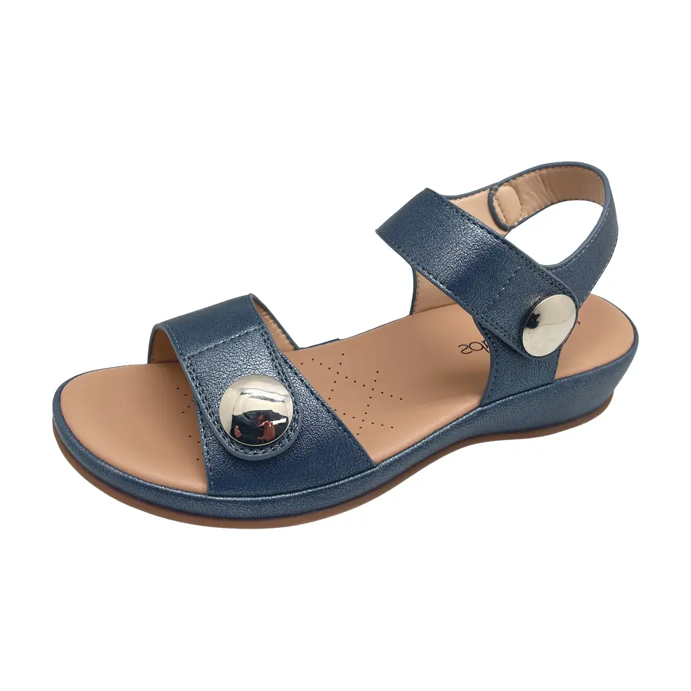 Simona Ricci's new sandal PASSION in NAVY is a classic 2-Bar Casual Sandal. The sandal features 2 Velcro Straps adorned with Flat Silver Shiny Studs. It is made on a Dressy self-Covered Low Wedge and features thick padding to the insole. A smart stylish sandal for summer.