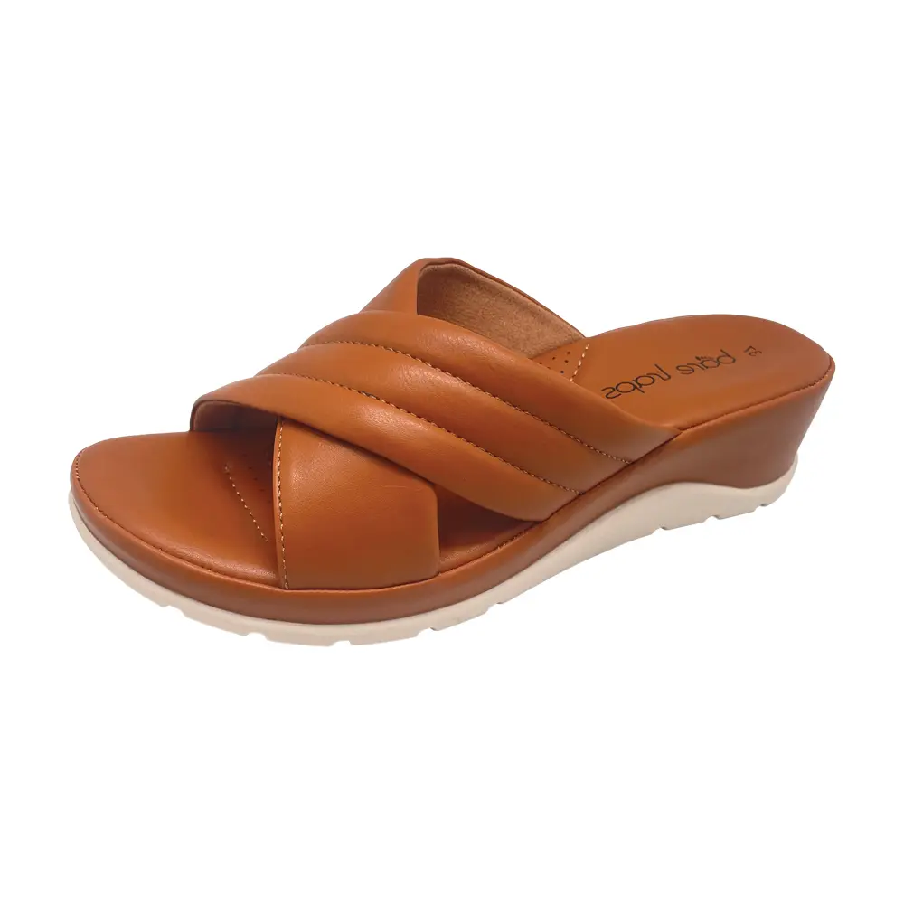 Slip into the Bare Traps Slide BARREL this Summer for a great Causl Look. Featuring 2x Wide crossover straps in a BROWN - one plain and one stitched and padded. It sits on a mid 2 piece wedge - top wedge covered, bottom piece rubber. The insole is neatly padded and and matching the upper colour. The Ultimate in simplicity and comfort.