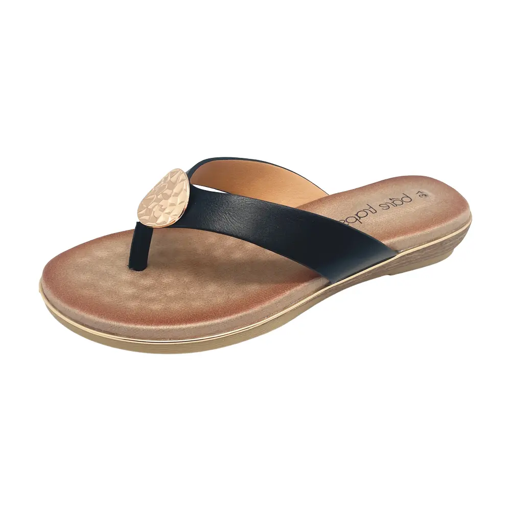 Bare Traps FREYA in BLACK is a style you'll love to wear. The Low Wedge Thong features a GOLD Circle Trim on a classic V Shape Design. The Natural Insole features 10mm foam padding and the Natural Stack wedge is finished with a Gold binding. Perfectly detailed and stylish for Summer Wear.